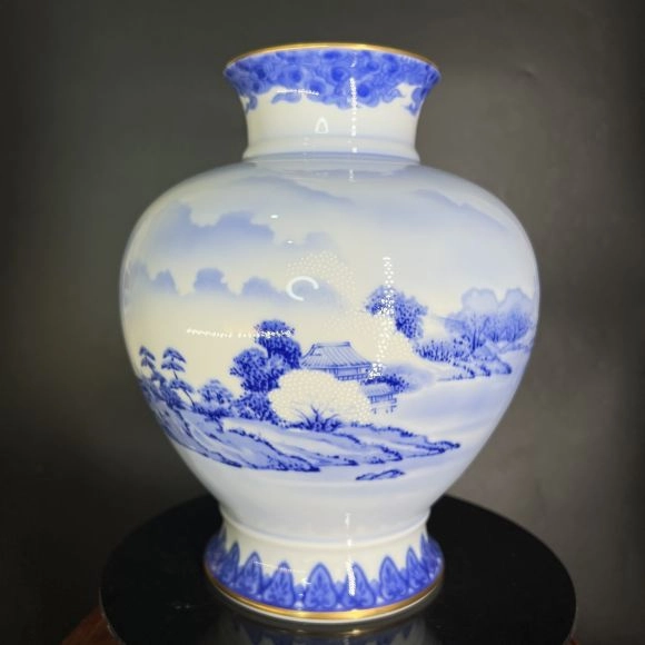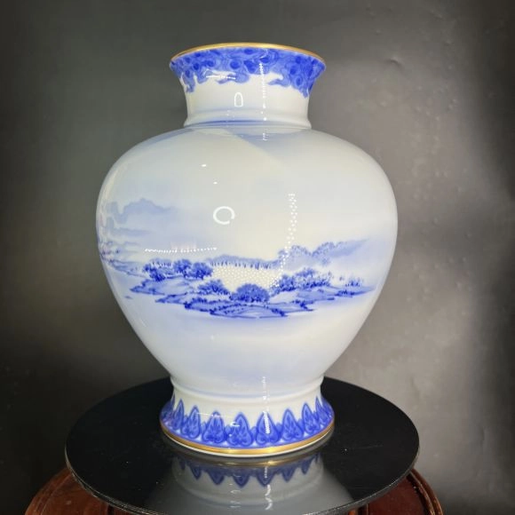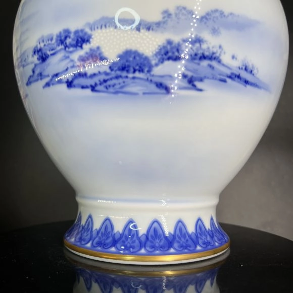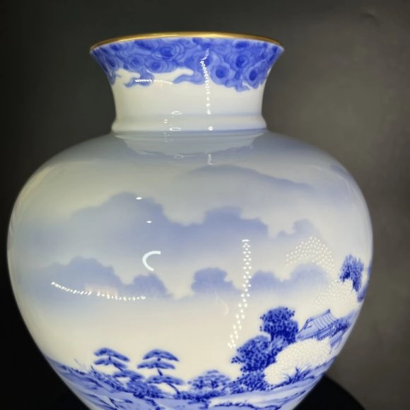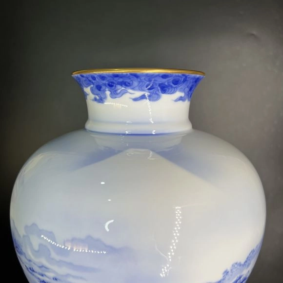 Bình sứ Fukagawa Nhật Bản với họa tiết phong cảnh núi Phú Sĩ vẽ tay xanh trắng, miệng viền mạ vàng là một kiệt tác mang đậm chất nghệ thuật Nhật Bản. Được chế tác thủ công từ thương hiệu danh tiếng Fukagawa, sản phẩm này không chỉ thể hiện vẻ đẹp tinh tế mà còn chứa đựng giá trị văn hóa sâu sắc.