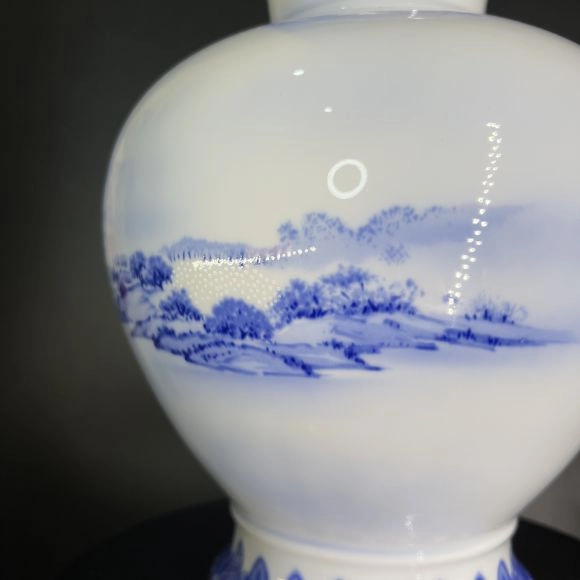 Núi Phú Sĩ là biểu tượng của đất nước Nhật Bản, tượng trưng cho sự thanh cao, mạnh mẽ và vĩnh cửu. Tranh phong cảnh núi Phú Sĩ được vẽ tay tinh xảo với hai gam màu chủ đạo là xanh và trắng, mang đến cảm giác thanh bình và trang nhã. Miệng bình được viền mạ vàng tạo điểm nhấn sang trọng, thể hiện sự quý phái và cao cấp.