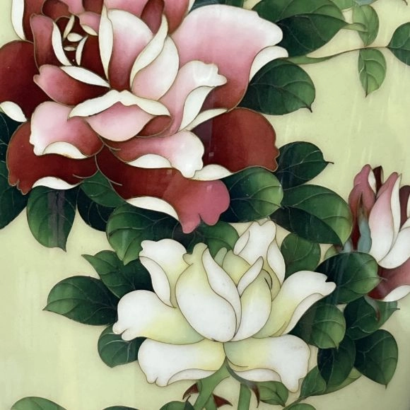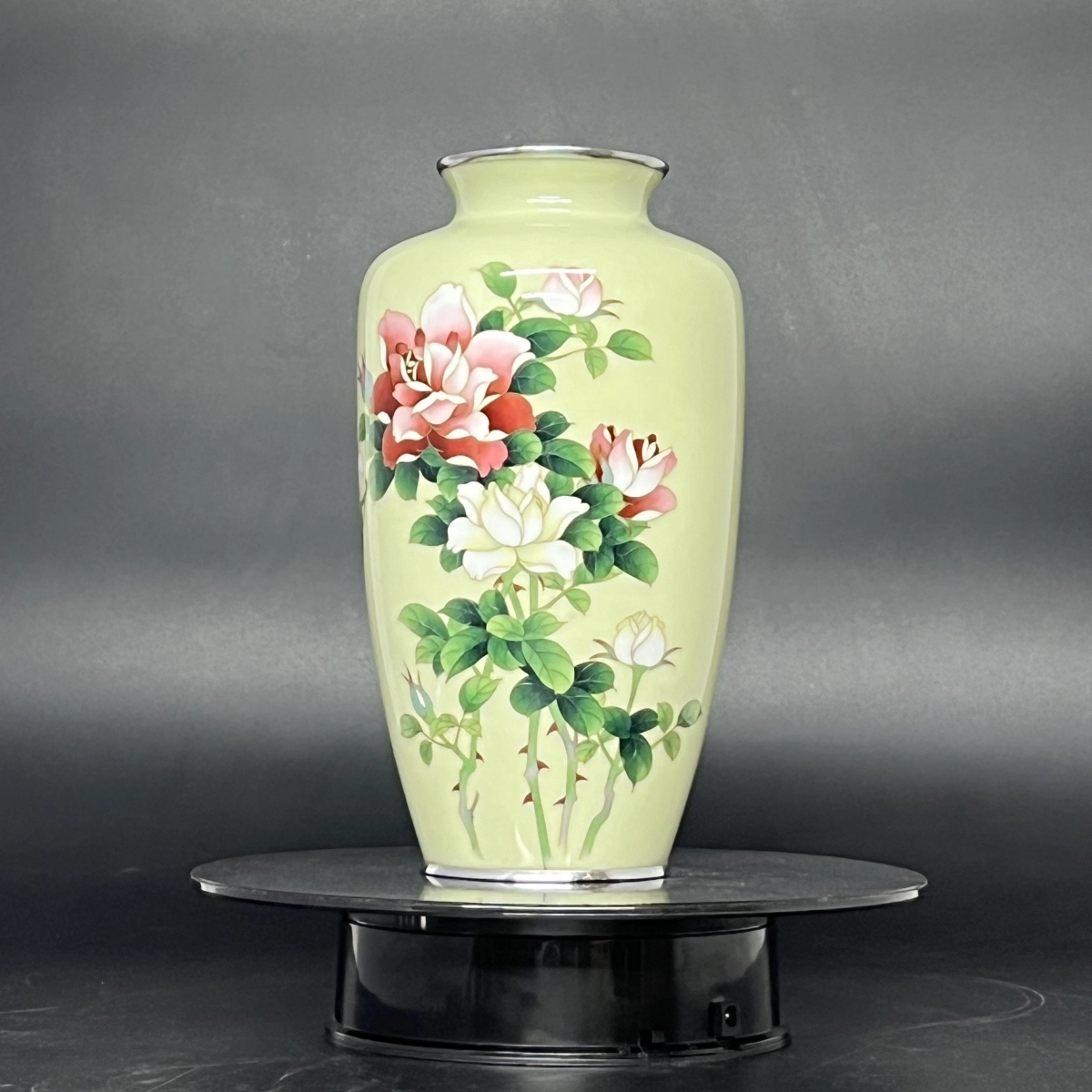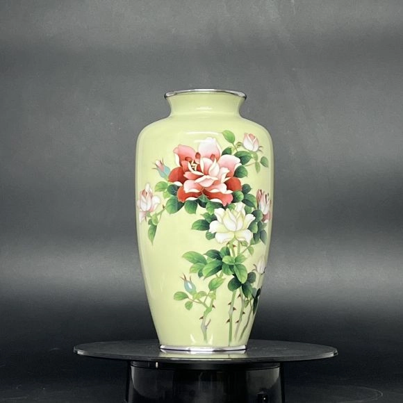 Bình hoa Cloisonne Shippo màu xanh pastel trang trí hoa hồng đỏ và hồng trắng