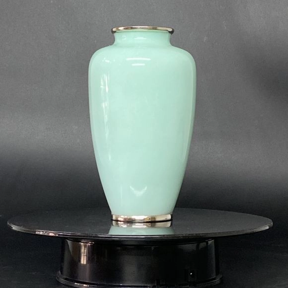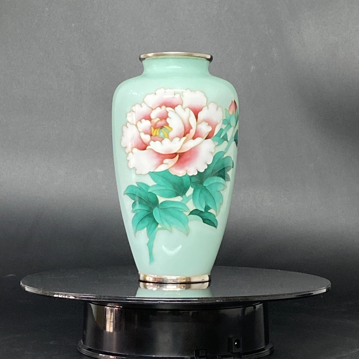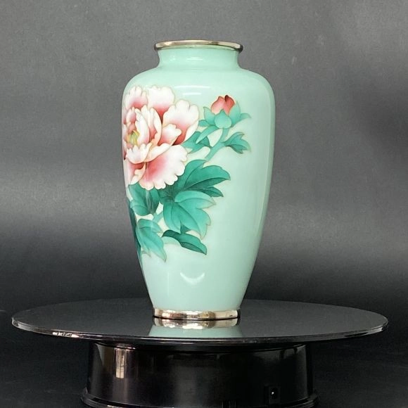 Bình hoa Cloisonne Shippo màu xanh ngọc bích với hoạ tiết hoa mẫu đơn sẽ làm tăng thêm vẻ đẹp cho không gian nhà bạn.