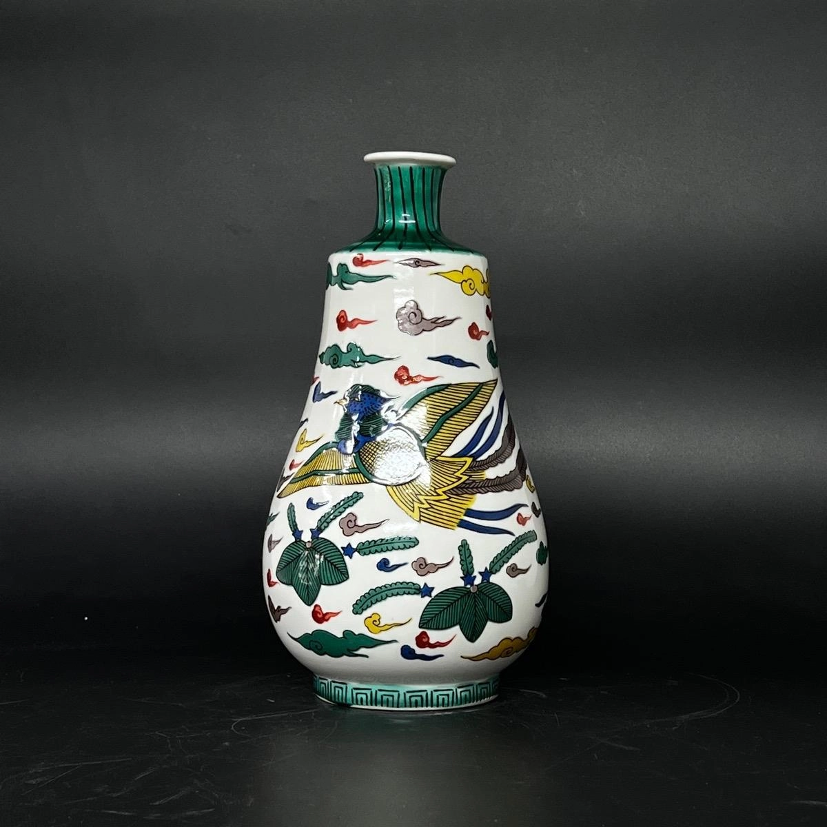Bình hoa vẽ tay Kutani Phượng vân phong là một tác phẩm nghệ thuật độc đáo và đẹp mắt. Với thiết kế phần thân bình sắc trắng cùng họa tiết phượng và vân phong được thêu trên bề mặt, chúng mang lại cho người xem cảm giác thanh lịch, sang trọng.