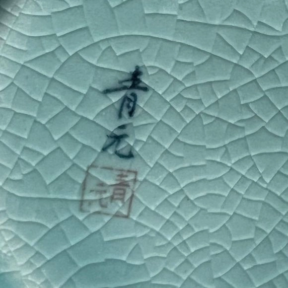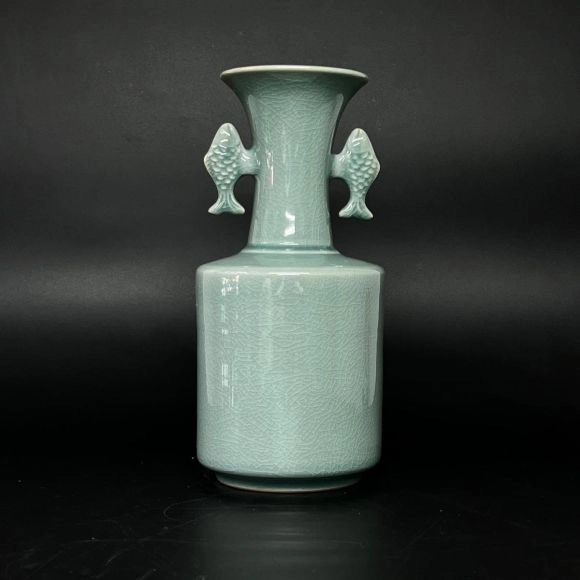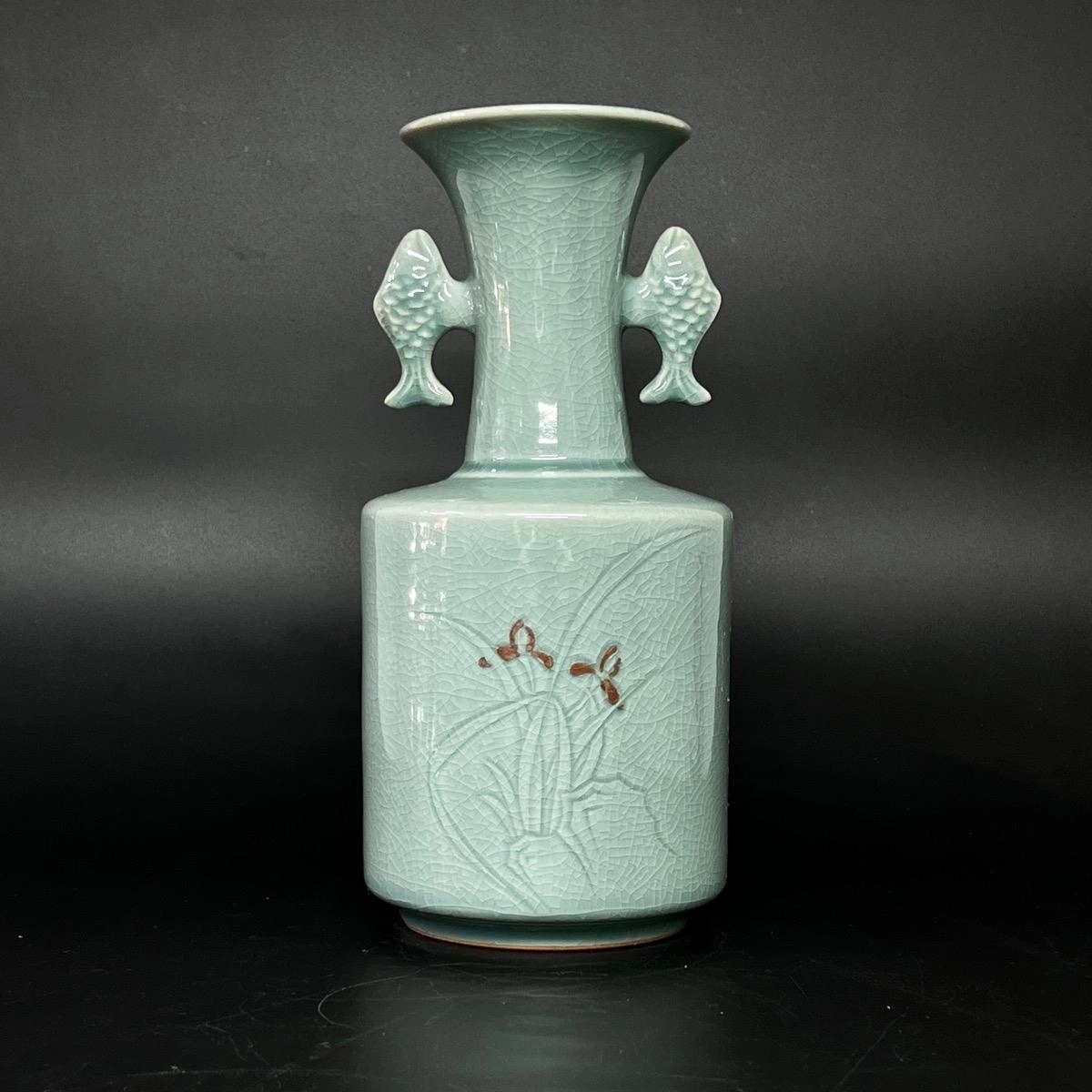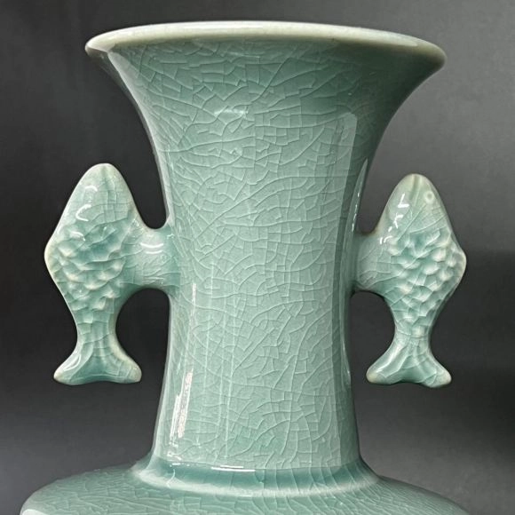 Giới thiệu sản phẩm: Choshun, bình hoa Nabeshima men ngọc có tai hình con cá, trường Urasenke, thế hệ thứ 15, Hounsai, ép hoa.