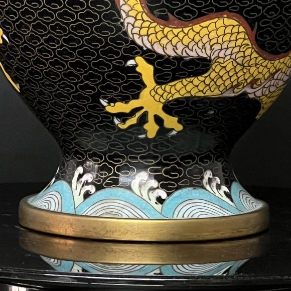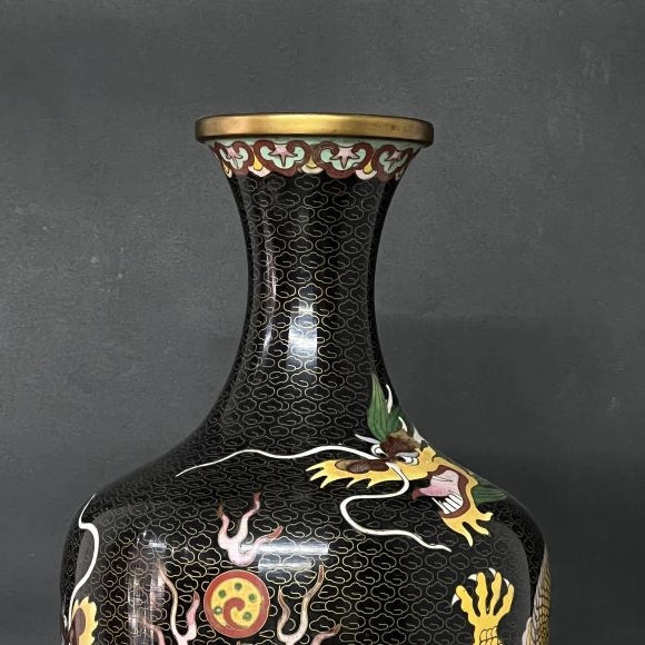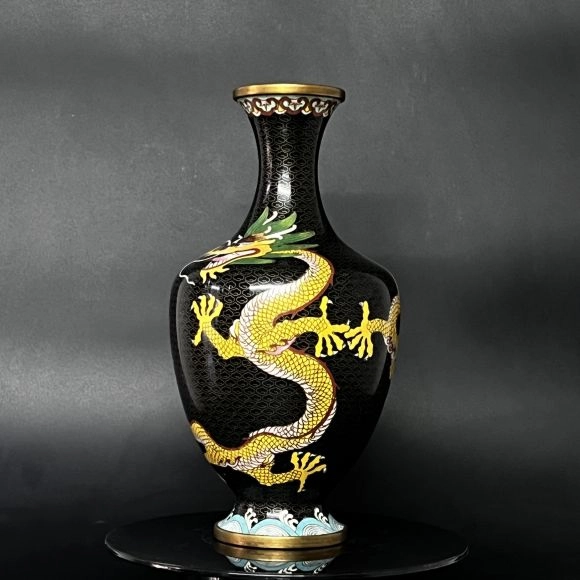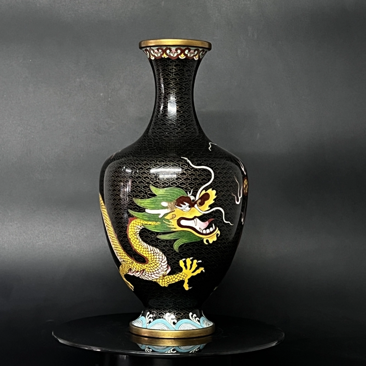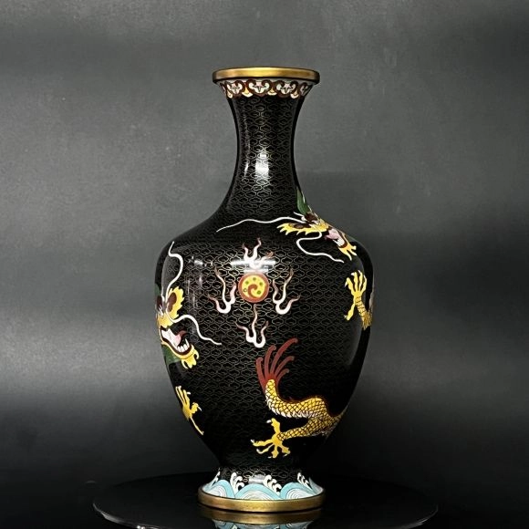 Bình pháp lam màu đen cổ điển hoạ tiết long phụng tranh ngọc là một sản phẩm trang trí độc đáo và sang trọng cho không gian nhà bạn.