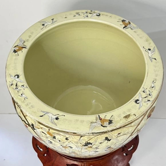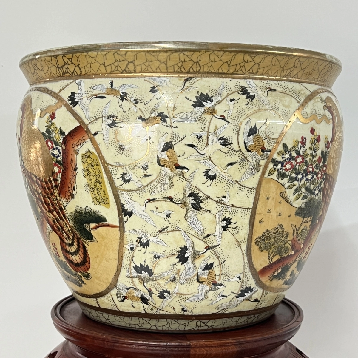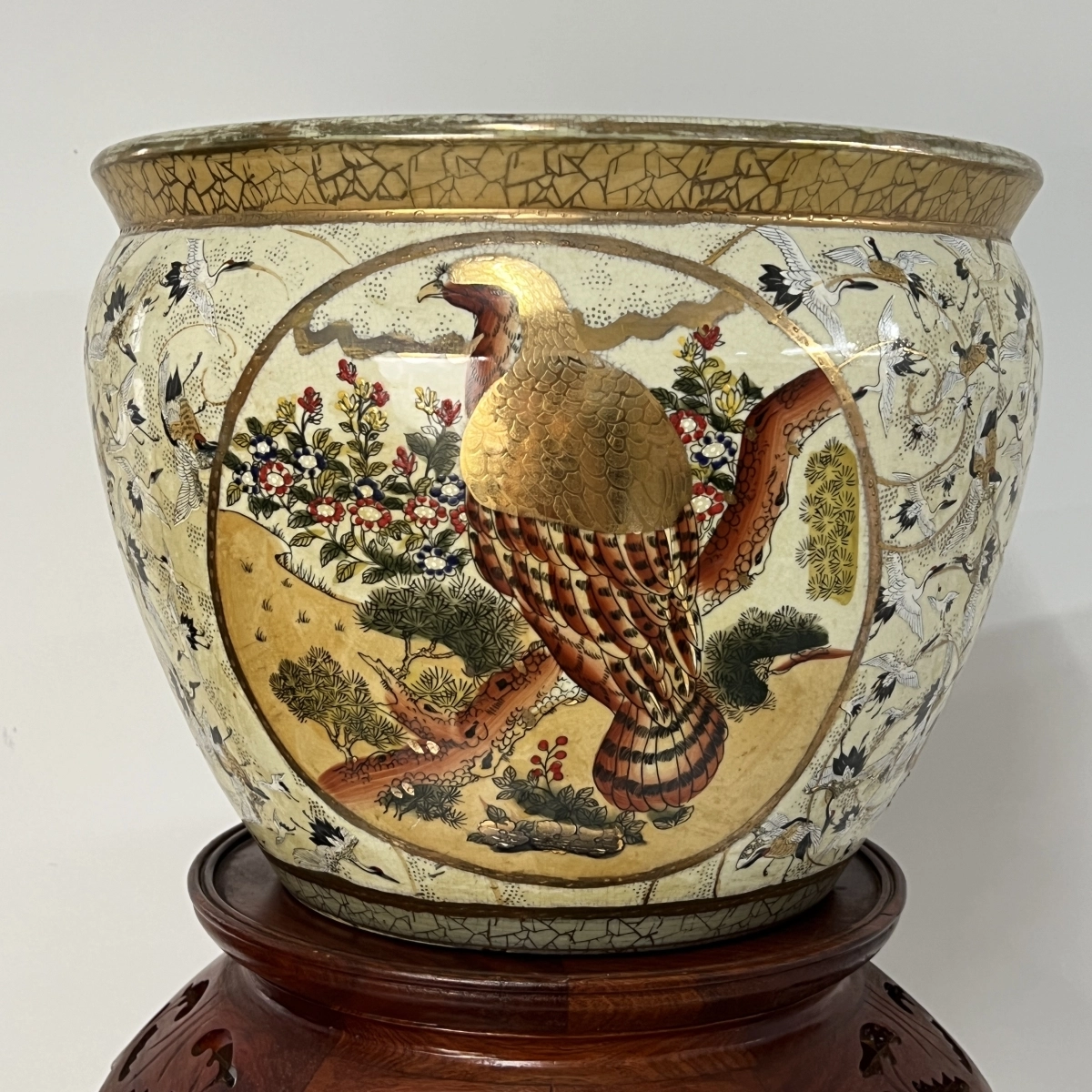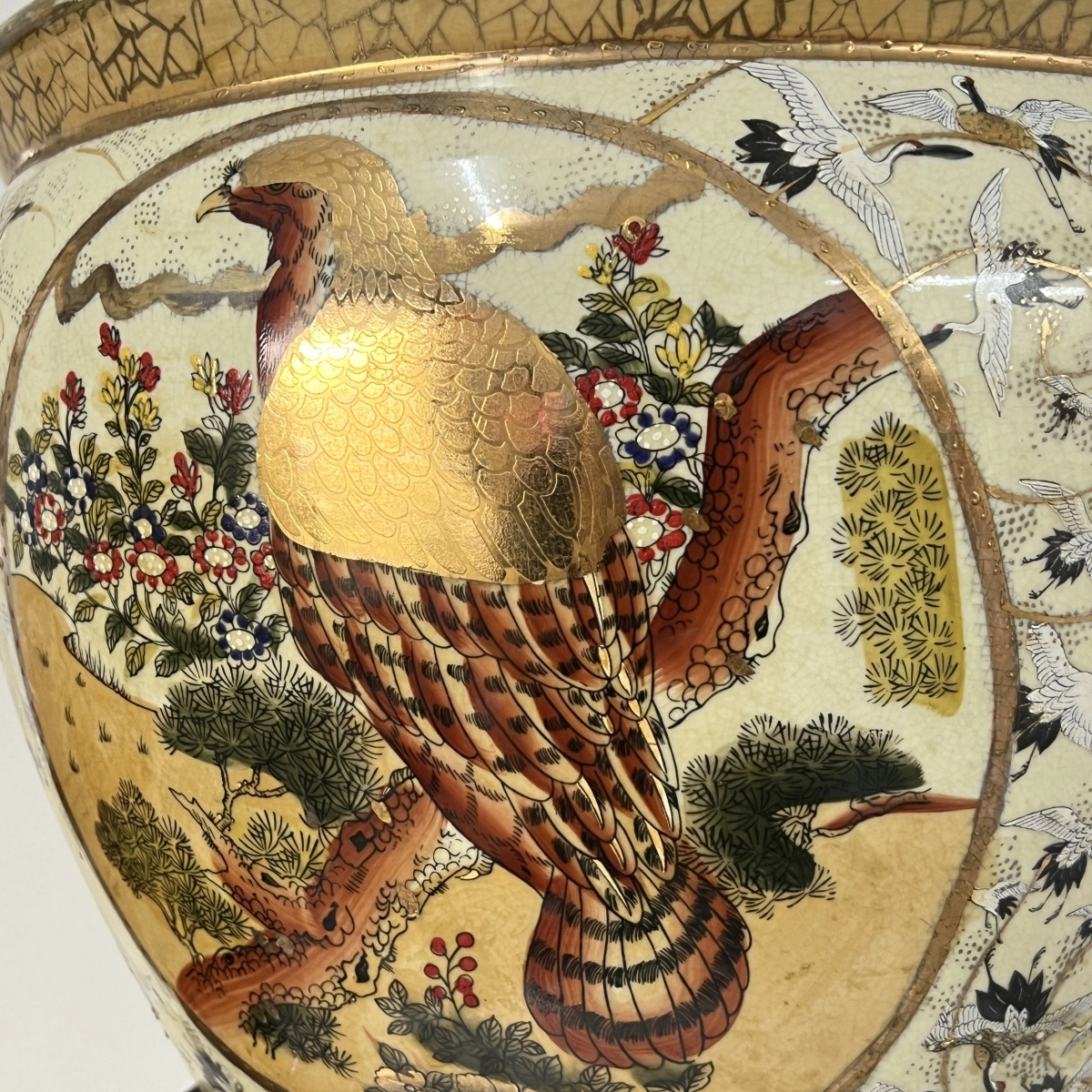 Bình Satsuma cổ truyền thống mang đến vẻ đẹp tinh tế với thiết kế độc đáo, được trang trí bằng hình ảnh chim sếu và hoa lan, kết hợp với lớp vàng thật 14-24K.