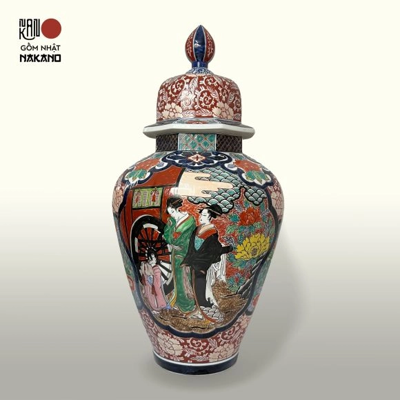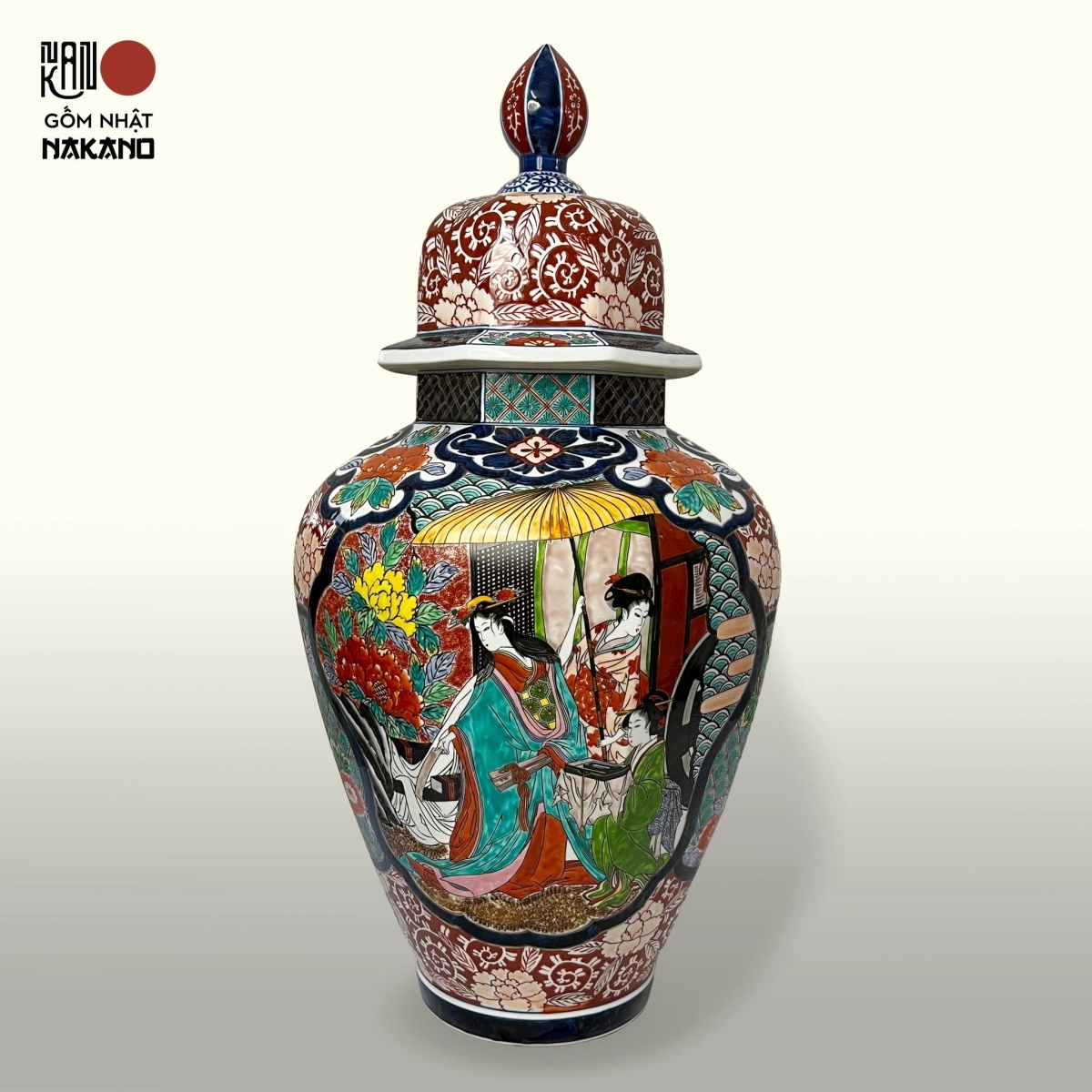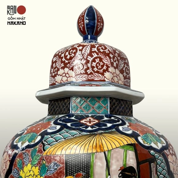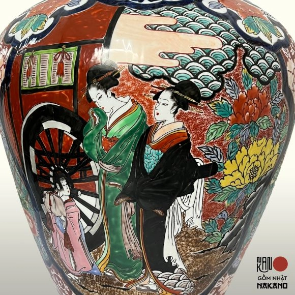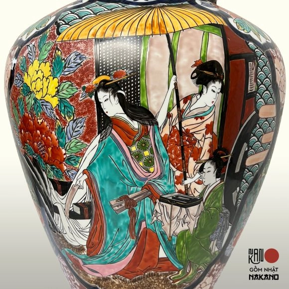 Choé ngũ sắc mô tả cảnh thiếu nữ với áo kimono cao quý đang thưởng hoa trong tiết xuân bên những bụi hoa cúc vàng pha đỏ, đậm hương thơm ngát. Thân choé vẽ cực kỳ xinh đẹp miêu tả hai cung nhân hay mệnh phụ phu nhân và tiểu thư thuộc giới quý tộc đang tán gẫu và ngắm hoa trong sắc trời trong xanh. Các biểu cảm trên từng khuôn mặt thiếu phụ đều rạng ngời, đằm thắm. Họ đều ung dung nhàn hạ, tận hưởng trọn vẹn cuộc sống mà không hề đánh mất vẻ đài các từ mái tóc hay thân áo đoan nghi. Nét tự nhiên, căng mọng xuân thì của người thiếu nữ qua những bộ kimono đơn màu cùng lớp phủ ngũ sắc cổ điển và những hoạ tiết đối xứng sắc sảo, tinh tế đã mang lại hiệu ứng sinh động, làm tăng thêm sự huyền ảo, sự lưu chuyển, tụ hội của trường năng lượng khiến chiếc choé trở nên nổi bật khi trưng bày bên cạnh nội thất của căn phòng.