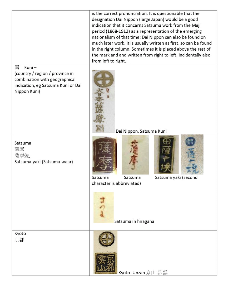 Thí dụ nếu gặp dấu triện Taizan-zo (帯山造) bên cạnh Dai Nippon (大日本) và Satsuma (薩摩), nhà sưu tập sẽ biết nghệ nhân Taizan Yohei IX (帯山 陽平,1856-1922) làm (zo) tác phẩm gốm Satsuma này phải trước năm 1922. Nếu biết thêm Taizan đã đóng cửa lò nung gốm năm 1894, thì các siêu phẩm ấn tượng của ông được tạo tác không muộn hơn năm 1894 - khoảng giữa của 100 năm vàng son chói lọi “gốm sứ Satsuma Nhật Bản” (1830-1930). Điều đó cũng có nghĩa là các vật phẩm chỉ có chữ ký sơn mà không có dấu gốm chìm, hoặc được đánh dấu bằng ký hiệu tem nhãn khác có thể được làm giai đoạn 1894-1922.