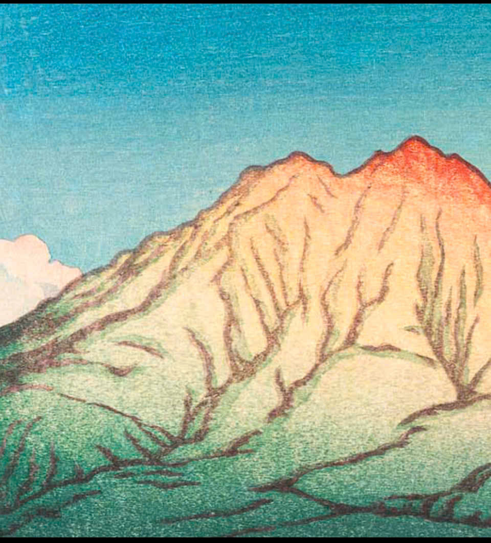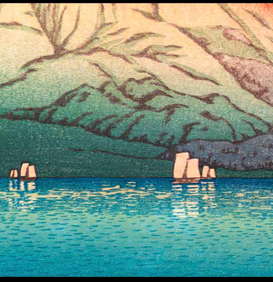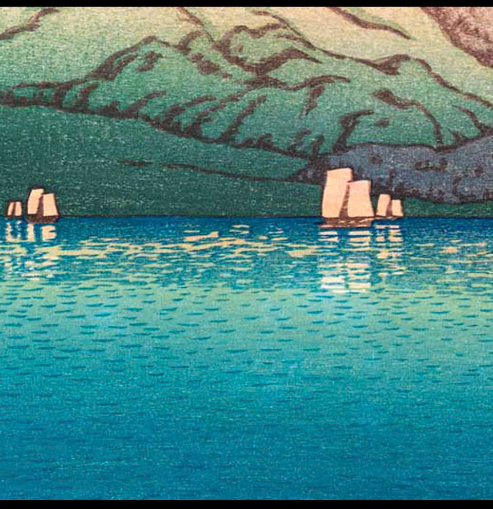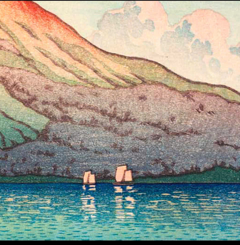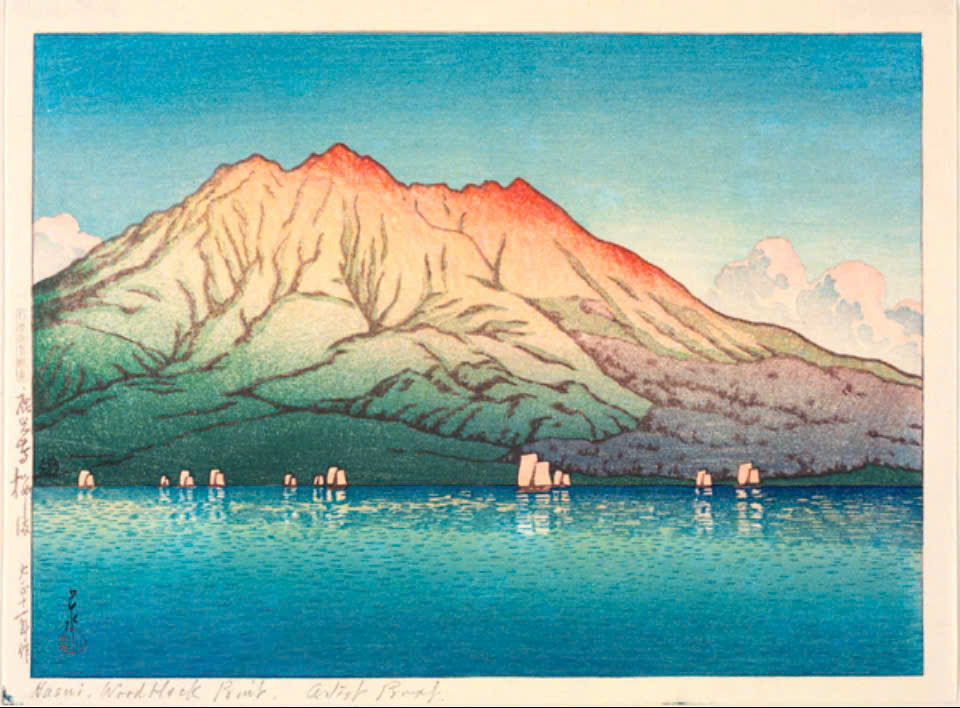 Tranh in khắc gỗ của hoạ sĩ Kawase Hasui - Tác phẩm: Hồ Kagaguchi, Núi Phú Sĩ ngược