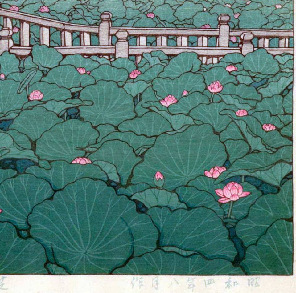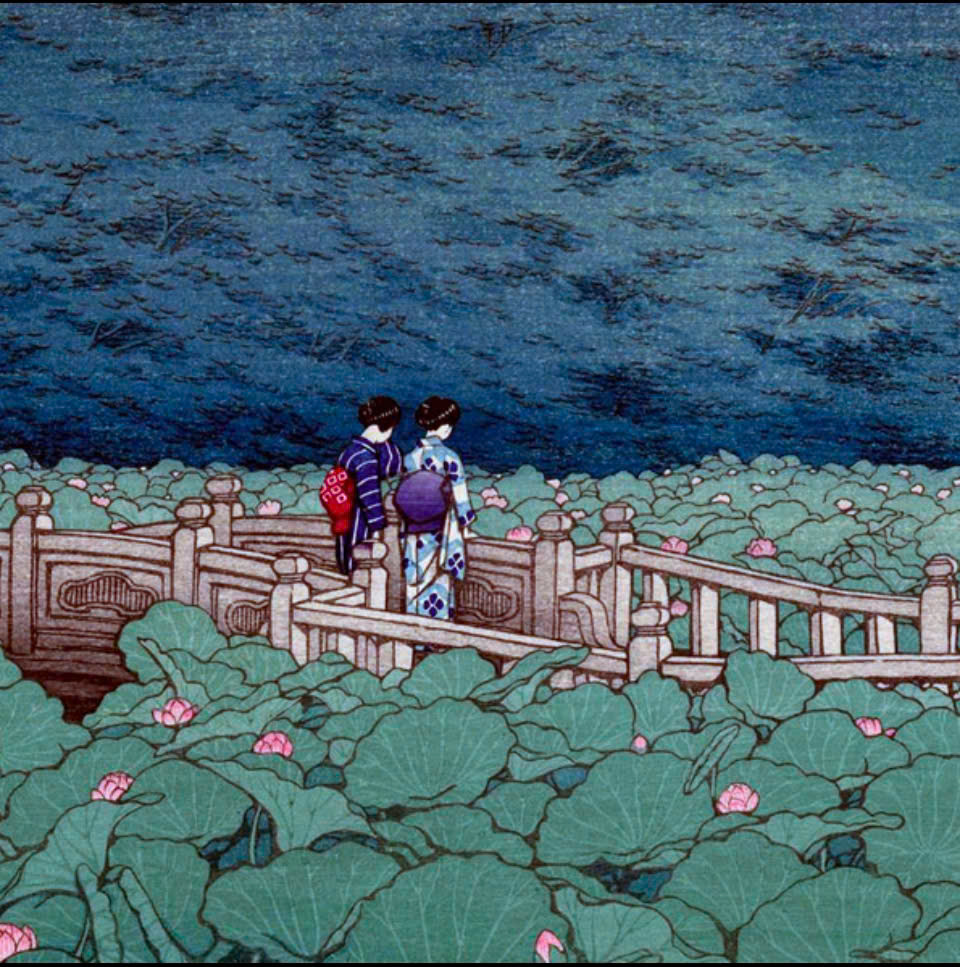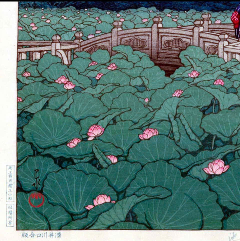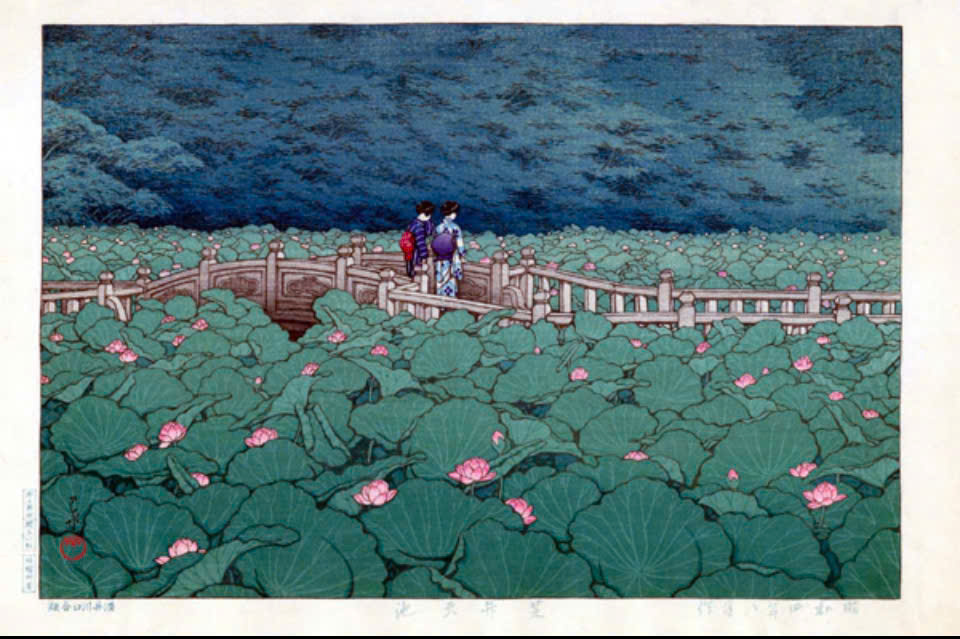 Tranh in khắc gỗ của hoạ sĩ Kawase Hasui - Tác phẩm: Hồ Kagaguchi, Núi Phú Sĩ ngược